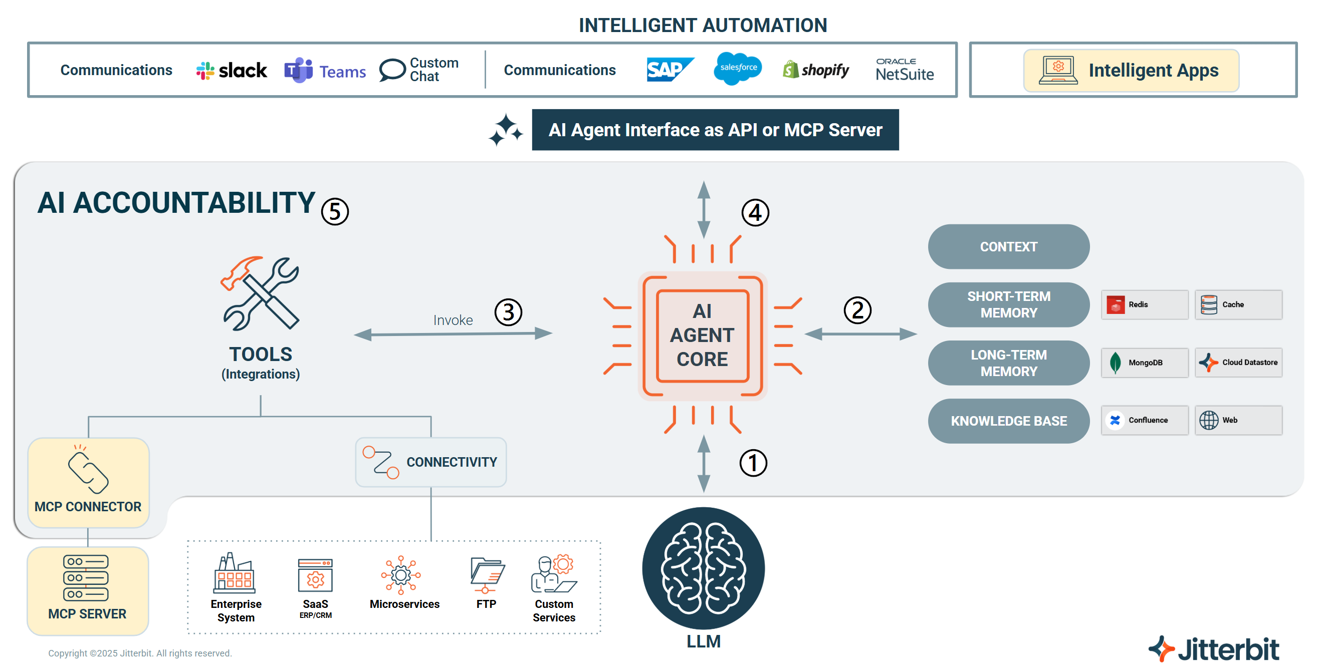 Every interaction is wrapped in Jitterbit's AI accountability framework, which provides a complete audit trail for governance and security. This includes the user's prompt, the LLM's reasoning, and the tool's execution.