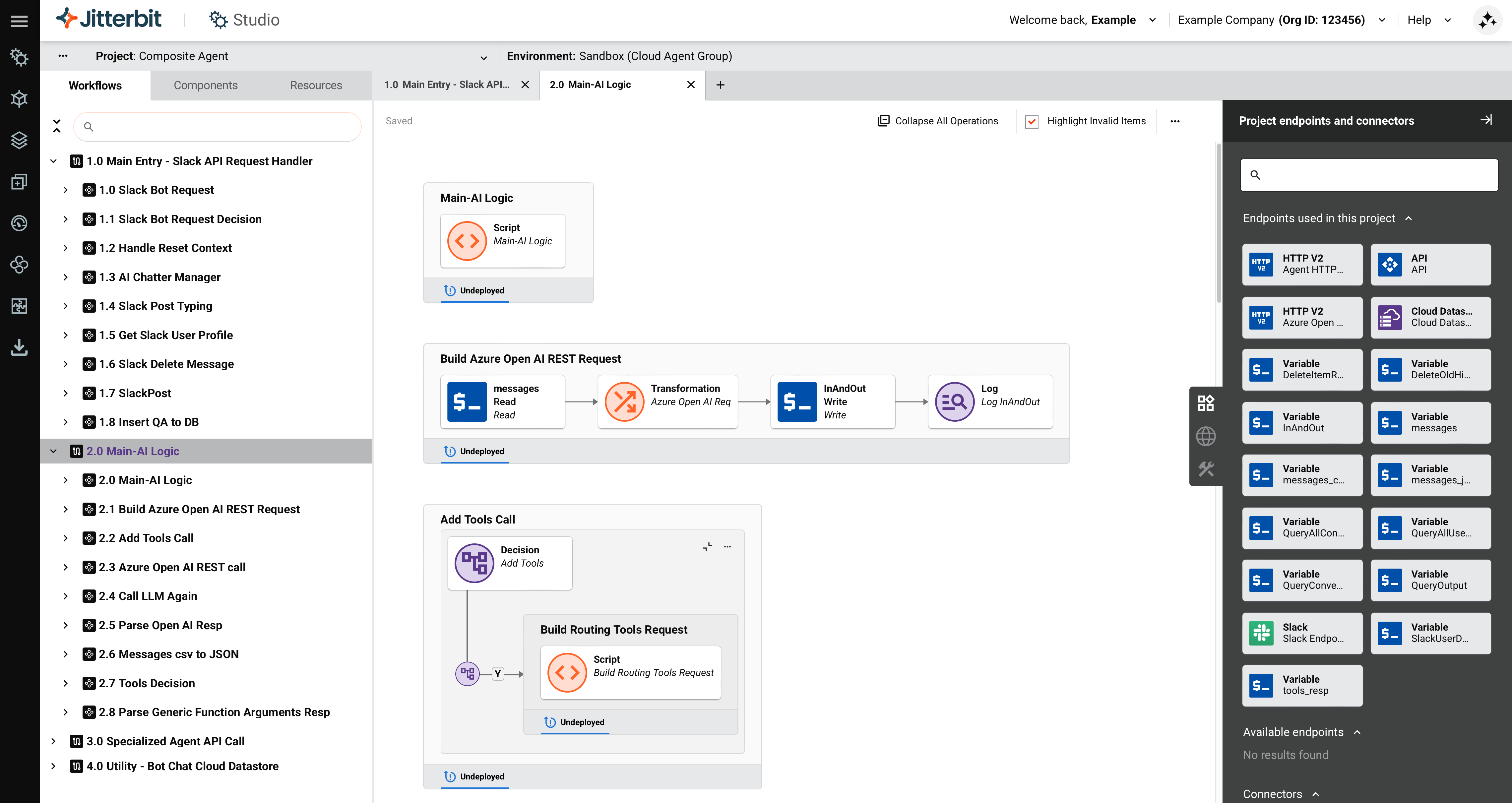 This guide shows you how to build a composite agent in Jitterbit Harmony using Studio. A composite agent provides a single interface for interacting with multiple specialized agents within your organization. The agent receives user queries, determines which specialized agent can best handle each query, and routes the request to that agent.
