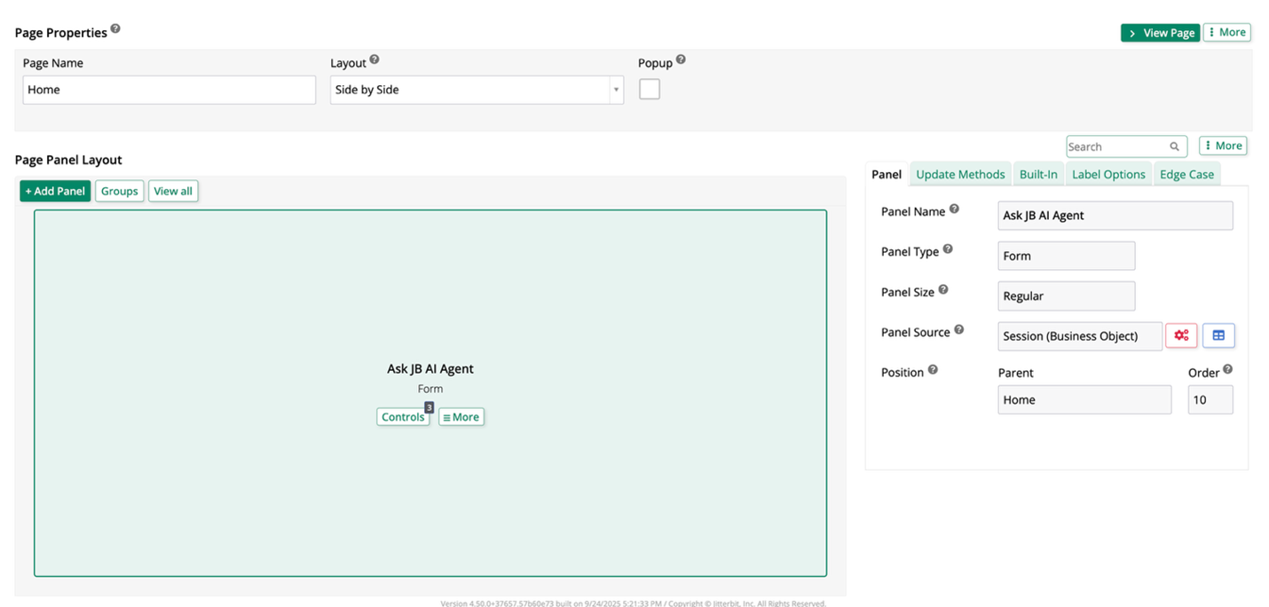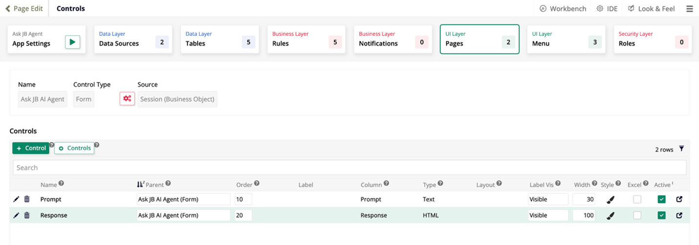 Build a front-end page by creating tables, panels, controls, etc. in the UI layer. Design the front-end page so that it allows the user to enter endpoint parameters needed for the AI agent and display the API endpoint response: