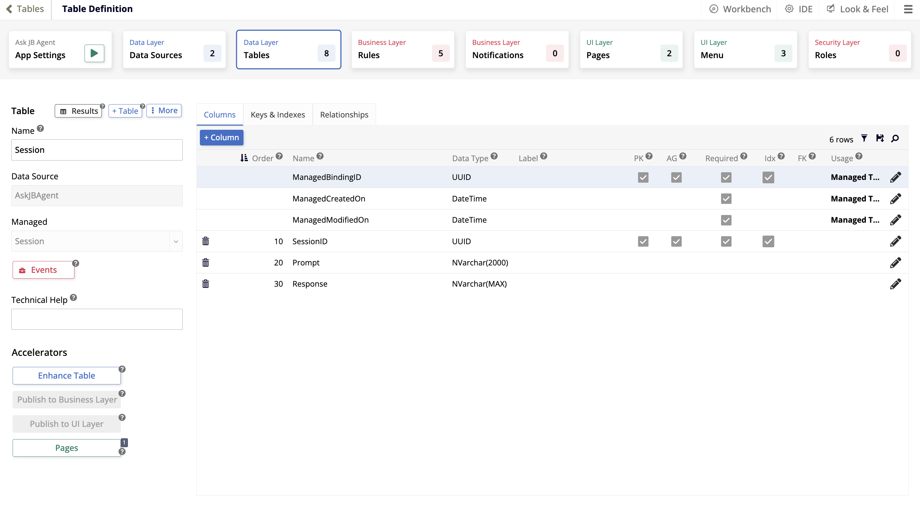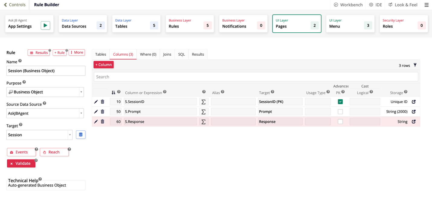 - Hybrid workflows: The AI agent handles the complex cognitive part of a process (for example, recommending a pricing strategy), while App Builder's standard services handle the transactional part (for example, using a database connector to execute the recommended price update).