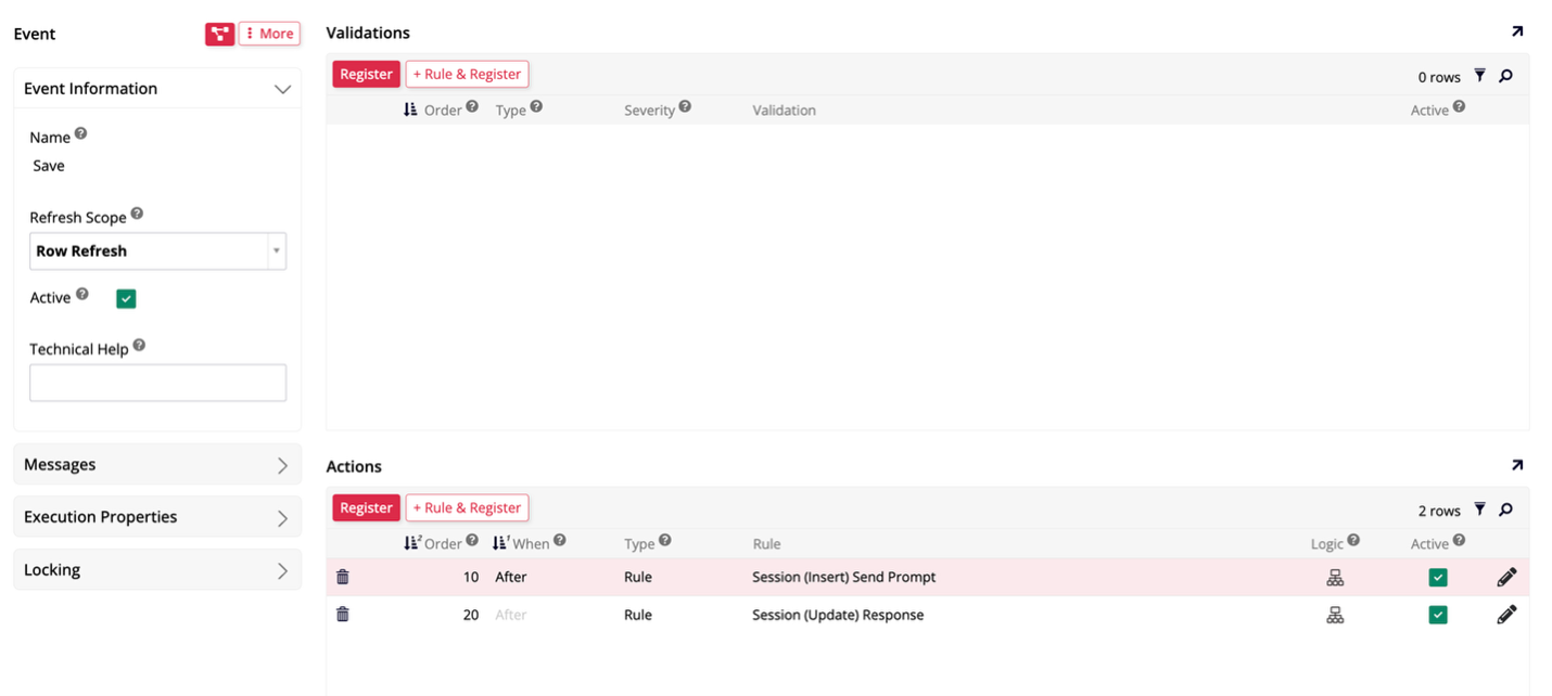 - Click Events on the business rule for the page and either add a rule event or use the intrinsic Save event.