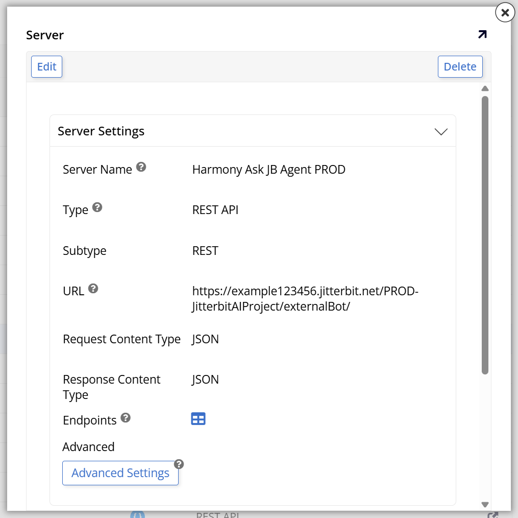 Click + Server and enter your configuration details in the dialog. The URL should be the API service URL of the API Manager API you created in building a reactive AI agent.