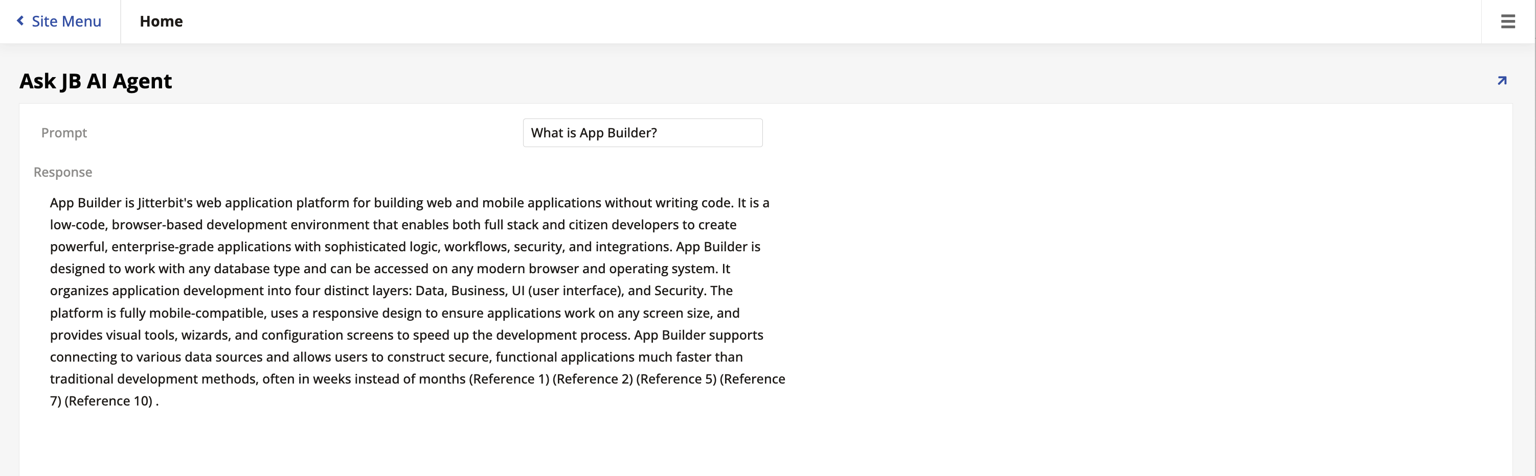 The preceding example demonstrates a simple integration: passing a user prompt to an AI agent and displaying the response. You can expand on this capability by leveraging App Builder's business logic layer and background services to create more intelligent, automated applications. Here are some ways to do that: