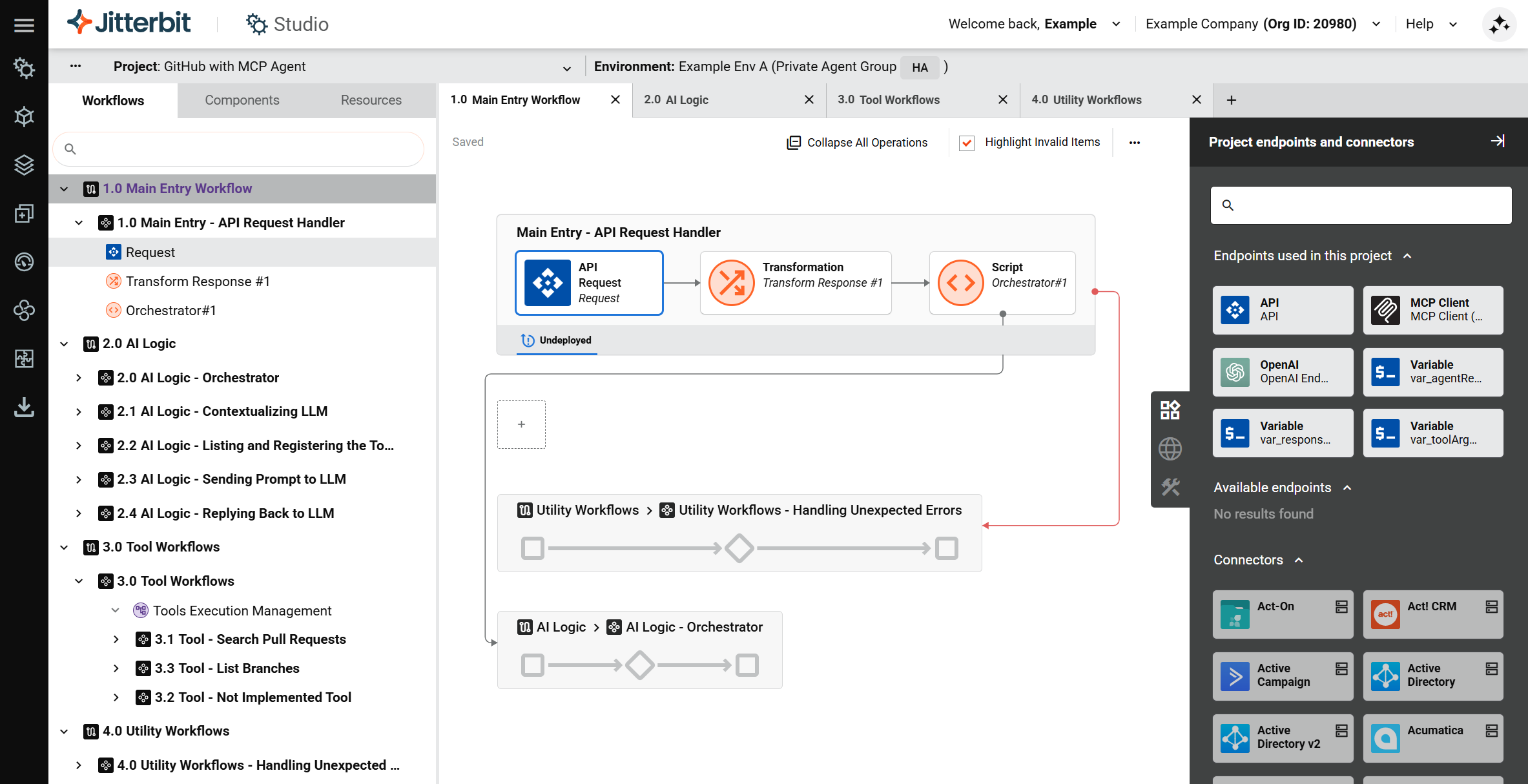 For learning purposes, reference the GitHub Agent with MCP provided through Jitterbit Marketplace for an implementation of this guide.