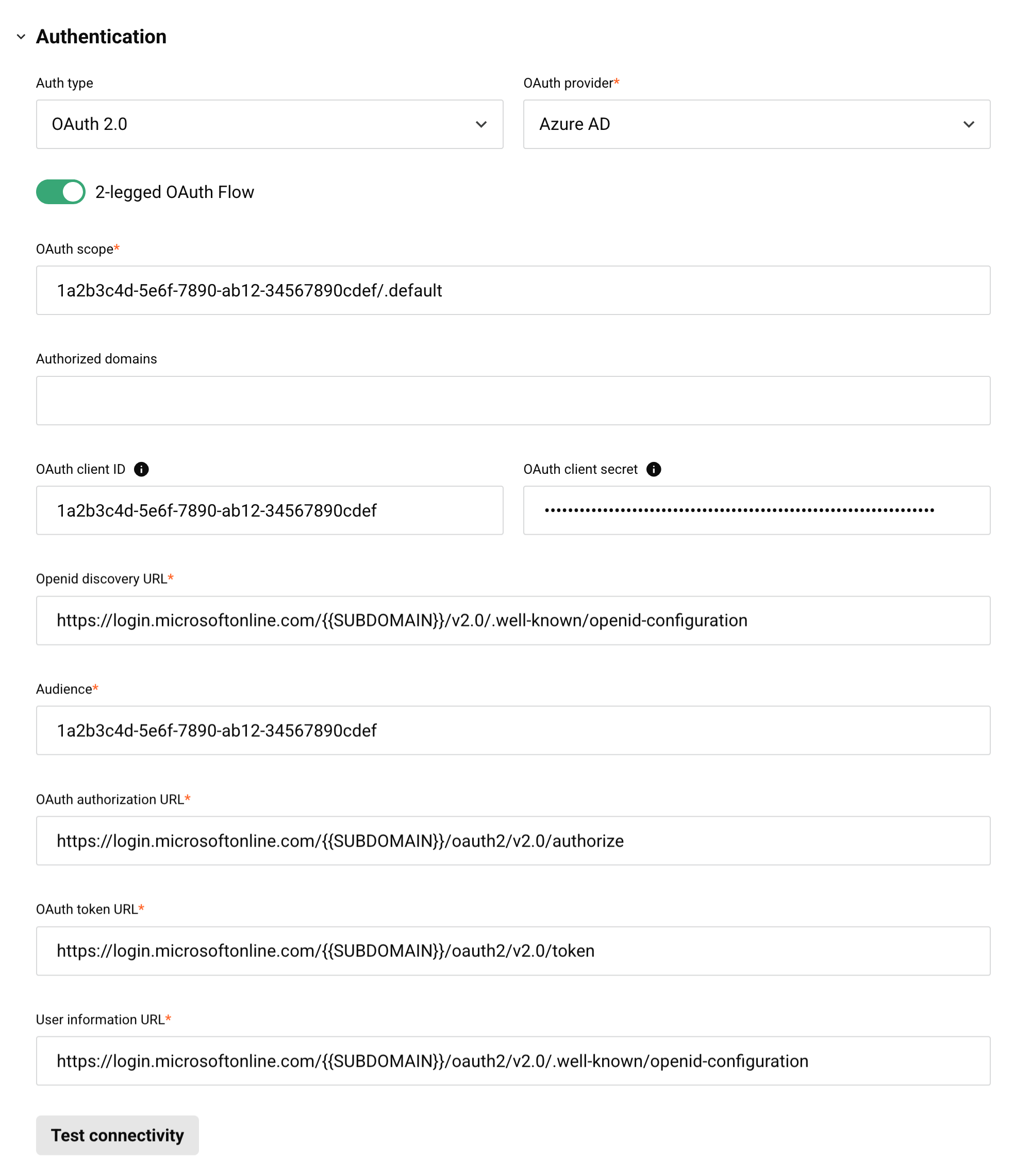 OAuth client secret: Optionally enter the client secret from step 1 for testing.