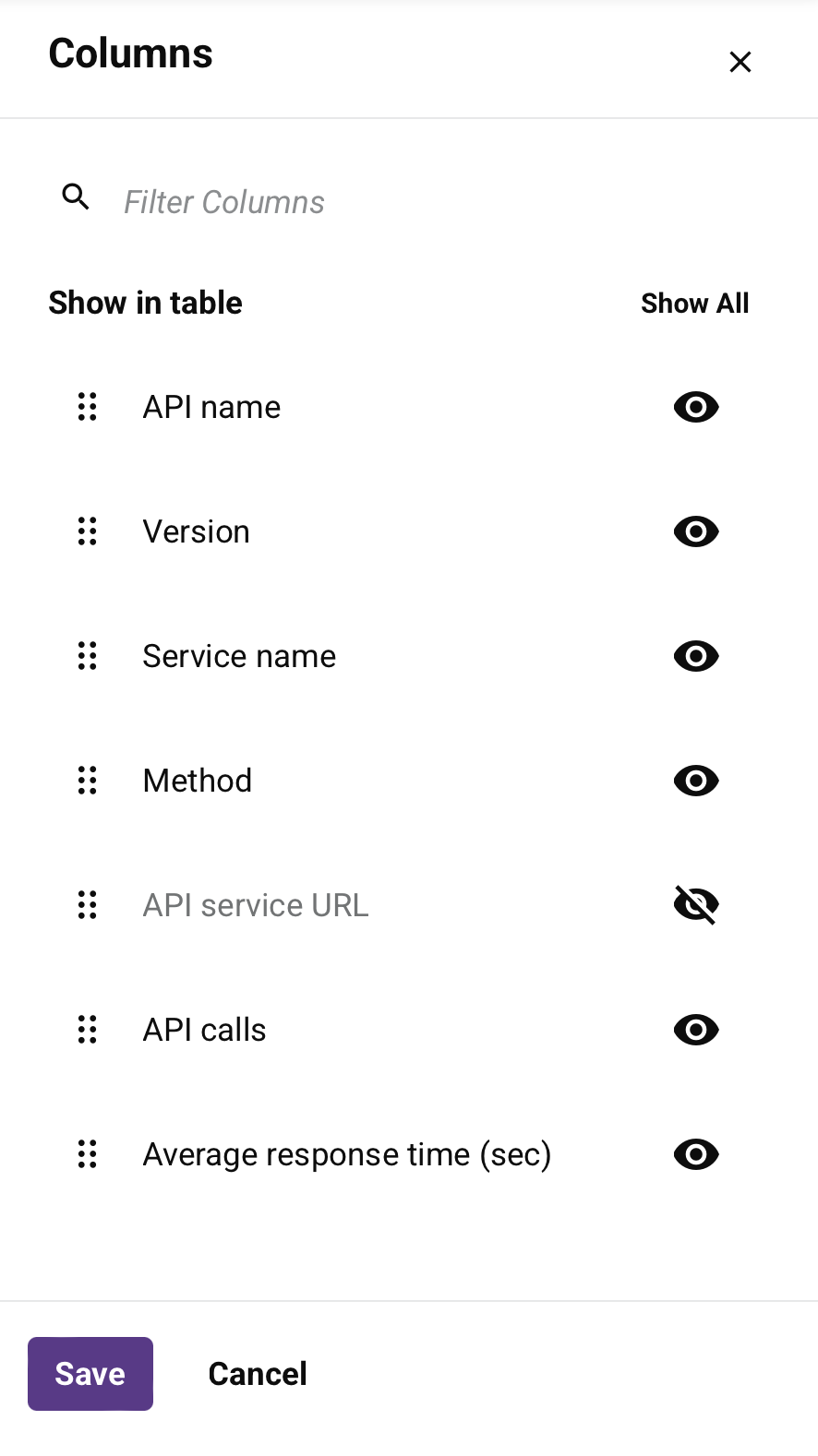 To change the visibility and order of columns click Filter columns. The Columns side drawer opens: