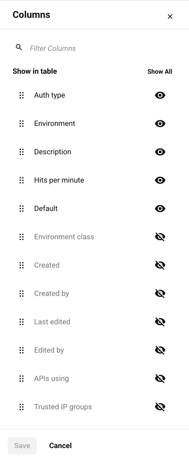 Filter columns: Click to change the arrangement and visibility of columns. The Columns drawer opens: