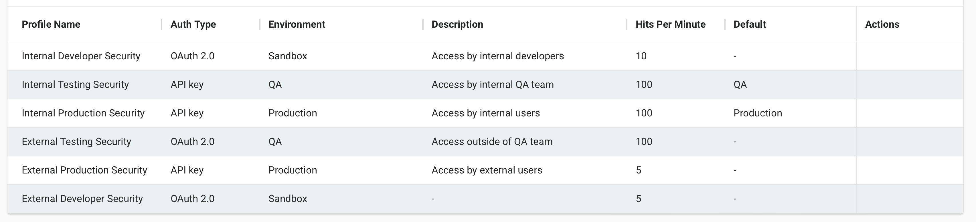 Default: Select to make this security profile the default for the selected environment. The default security profile will be preselected when a new API is created. Only one default security profile can be selected in each environment. After a default security profile has been specified for an environment, selecting a different security profile as the default will replace the existing default security profile selection. Selecting or changing the default security profile will not affect the security profile assigned to existing APIs.