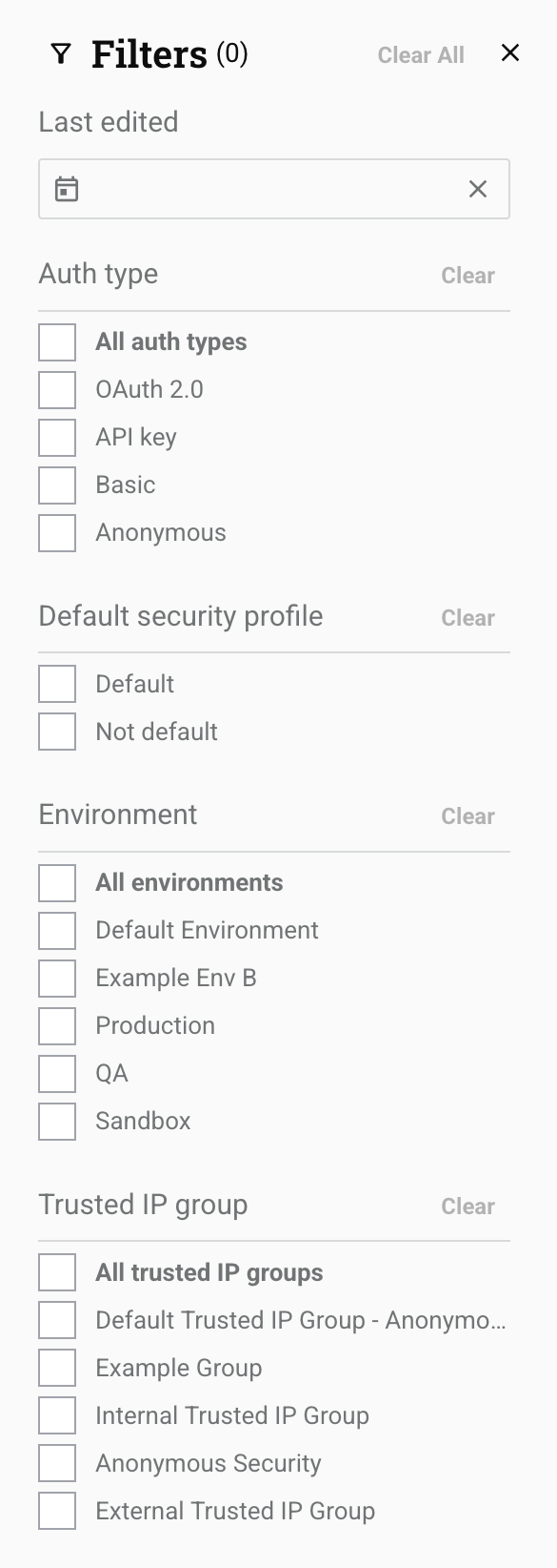 Auth type: Select the authentication types for the security profiles. Options include OAuth 2.0, API Key, Basic, or Anonymous. When all filters are unselected, security profiles with any authentication type appear.