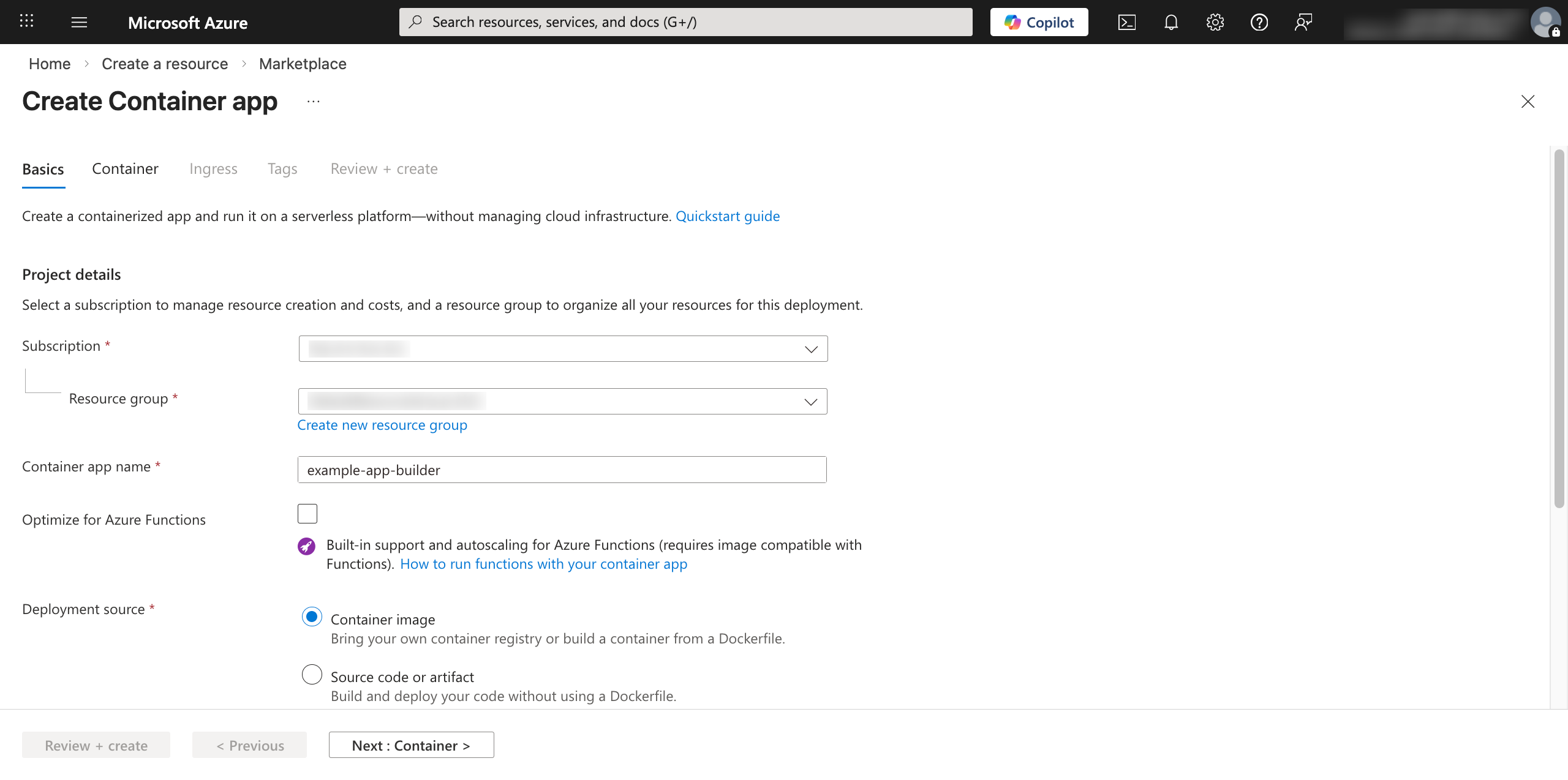 • Container app name: Enter a name for your app.