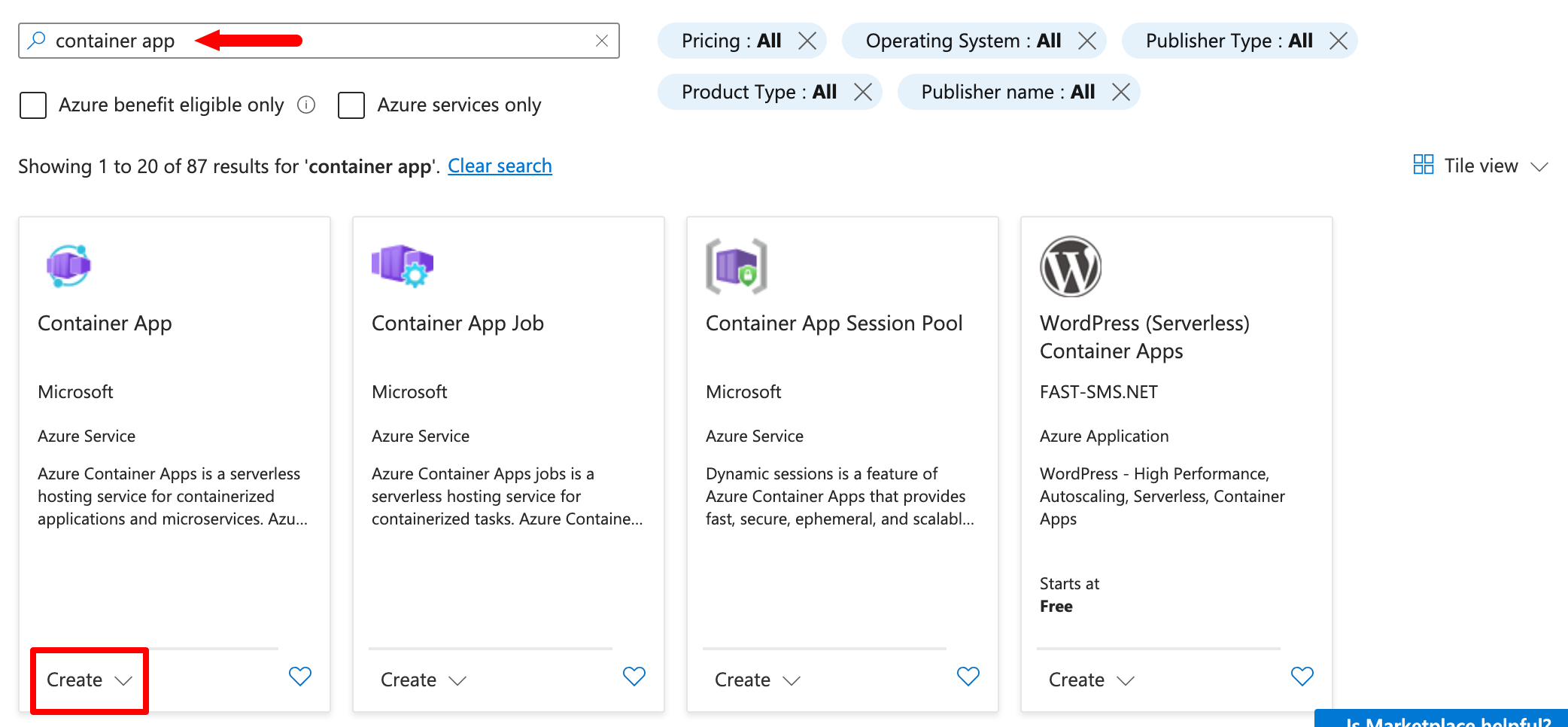 3. In the Marketplace search bar, enter Container App.