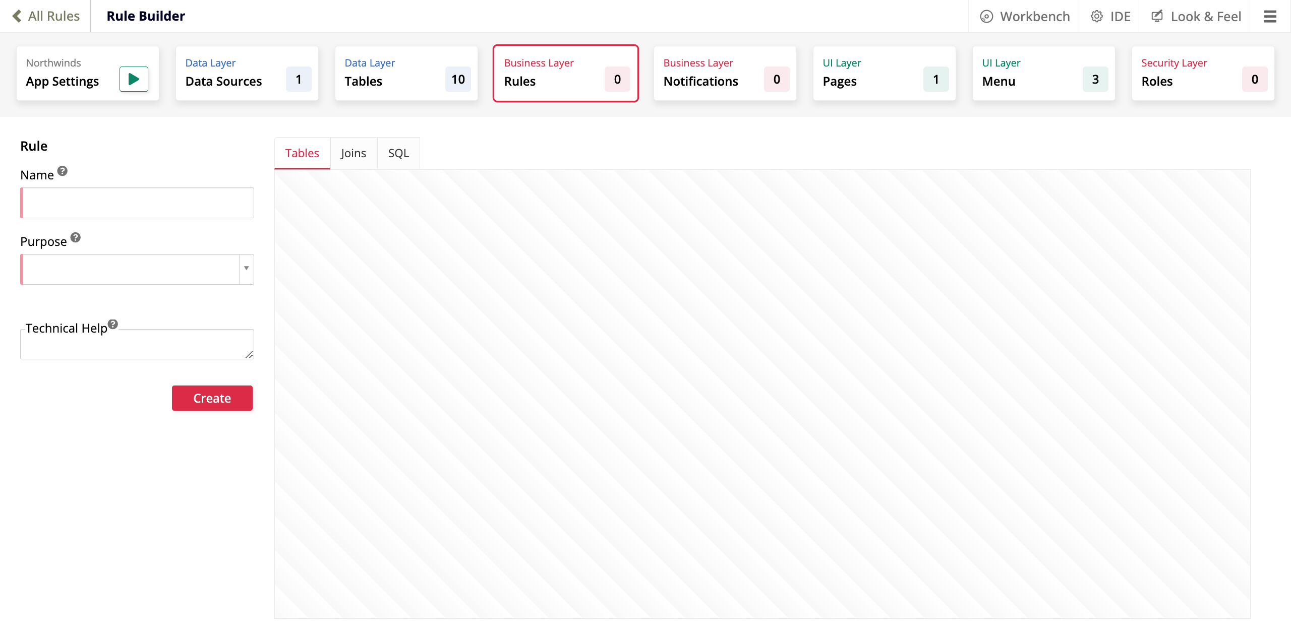 It's time to practice what you've learned. The application we're creating will need data from several tables present in the Northwinds database. Go over the tables listed below and create source objects for each one following the steps described above. You can find + Rule buttons in the App Workbench home page, or in its Rules tab.