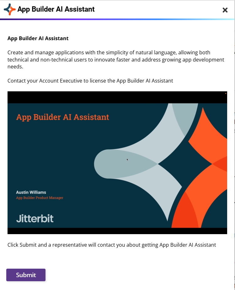 Die Option Jitterbit App Builder AI Assistant, die in Ihrer App Builder-Lizenz enthalten ist.