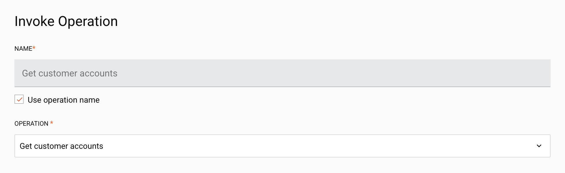 Usar nombre de operación: Cuando está seleccionado, el nombre de la instancia de la herramienta Invocar Operación (Beta) coincide con el nombre de la operación seleccionada en el campo Operación. El campo Nombre se desactiva y se ajusta automáticamente al nombre de la operación cuando se cambia:
