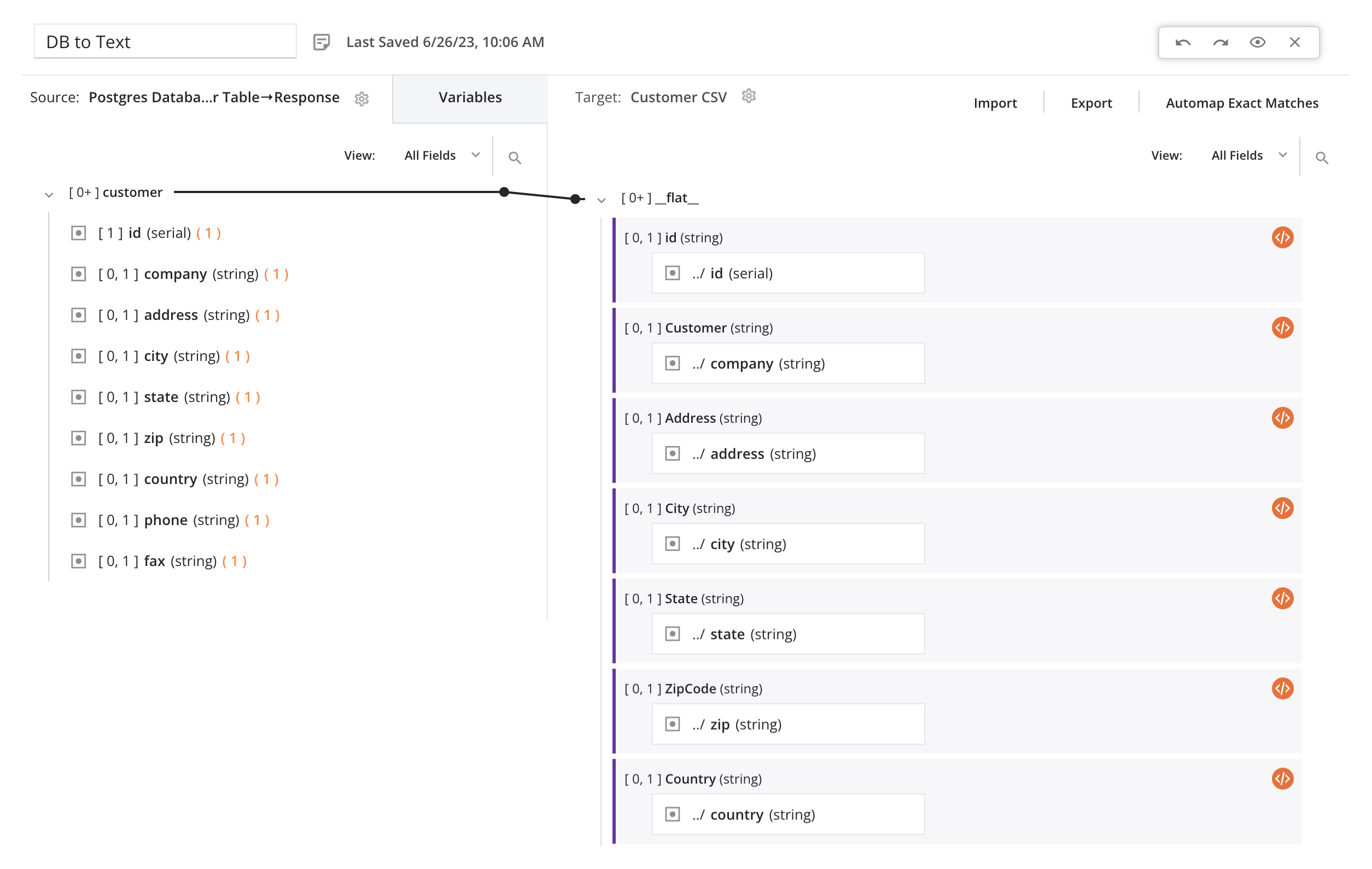 companyparaCustomer, ezipparaZipCode. - Ao longo do topo do cabeçalho de transformação, clique no botão cinza Preview para iniciar o processo de visualização para testar e validar os mapeamentos. Clique em Next para implantar os componentes listados e, em seguida, clique em Finished.